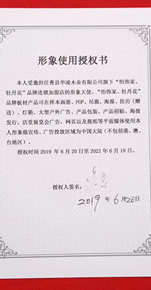 “牡丹花”“怡飾家”品牌是公司主營的注冊商標,并與明星句號達成合作。14年的板材專業精神和持續穩健的行業資源優化整合。